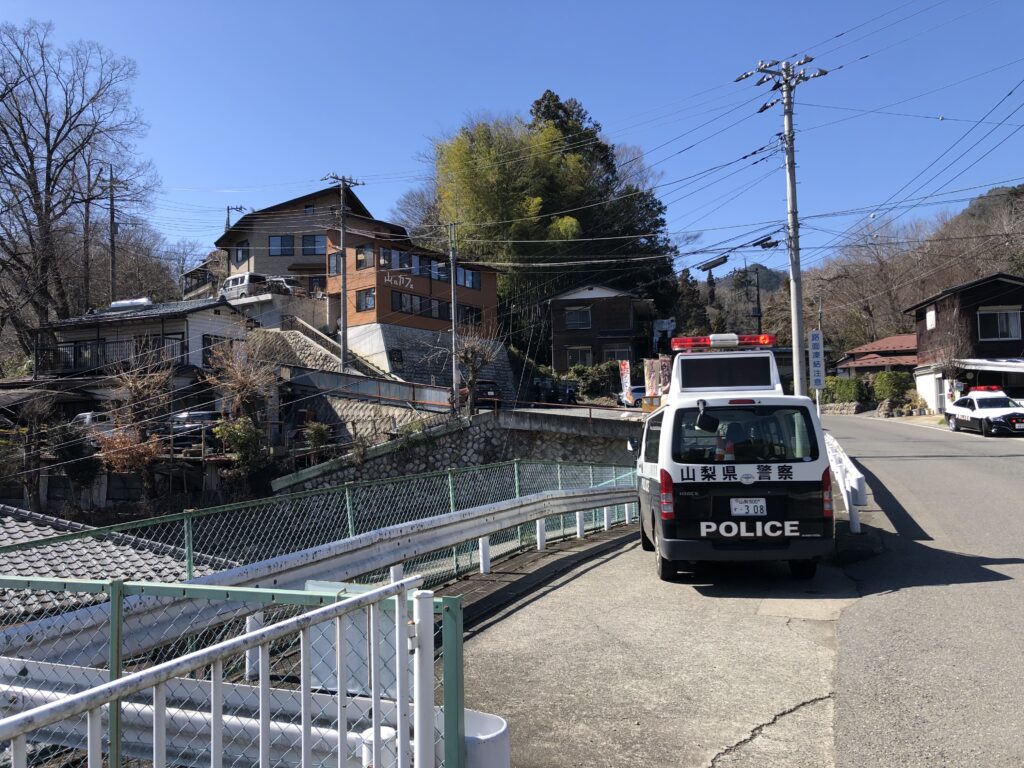 ・要害山から下山したところに山のカフェがありますが、そこでパトカーが2台止まっており、高齢者と若者から事情聴取をしていました。高齢者はどうやら軽トラックに乗っていた農家の方らしく若者と問題を起こした模様。若者はバイカーかな。